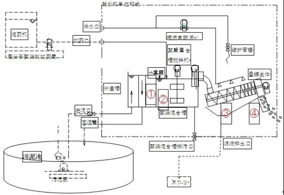 1、通過進(jìn)泥泵將污泥輸送至計(jì)量槽流入到絮凝混合槽,多余的部分從溢流管回流到污泥池。濾液從排出口排出。